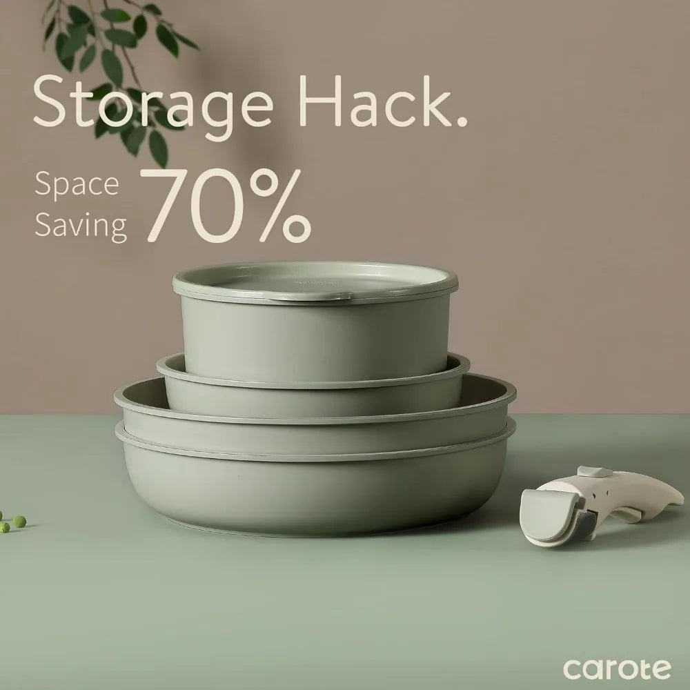 - For a clutter-free cupboard: Optimal storage and easy stacking with the handles off saves up to 70% more space of detachable handle pots and pans set.