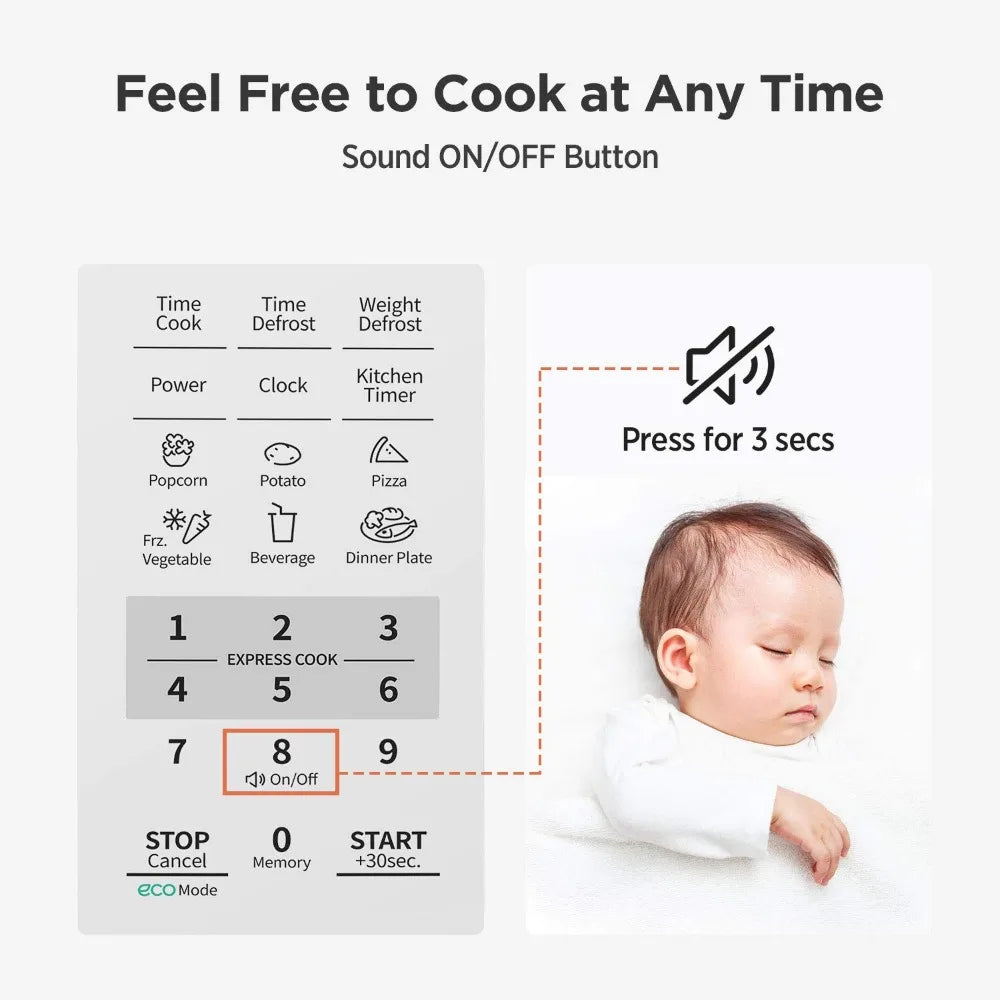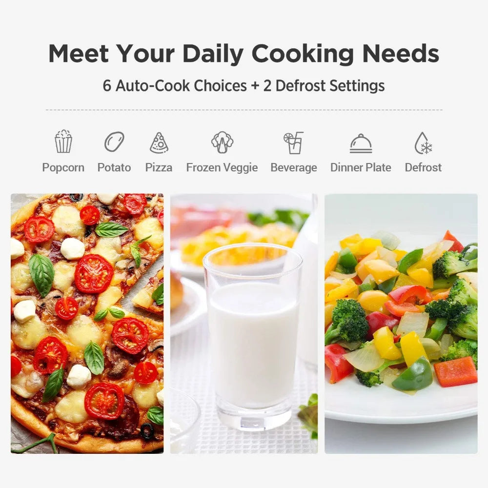 - Mute Function, settings, clock, kitchen timer, Child safety lock, Easy auto-cook functions: Popcorn, Potato, Pizza, Frozen Veggie, Beverage, Reheat