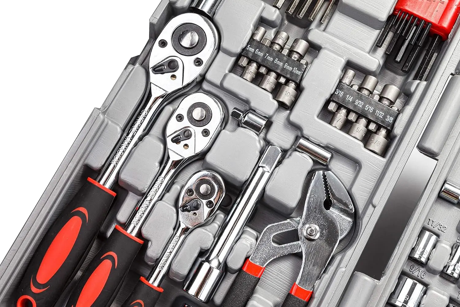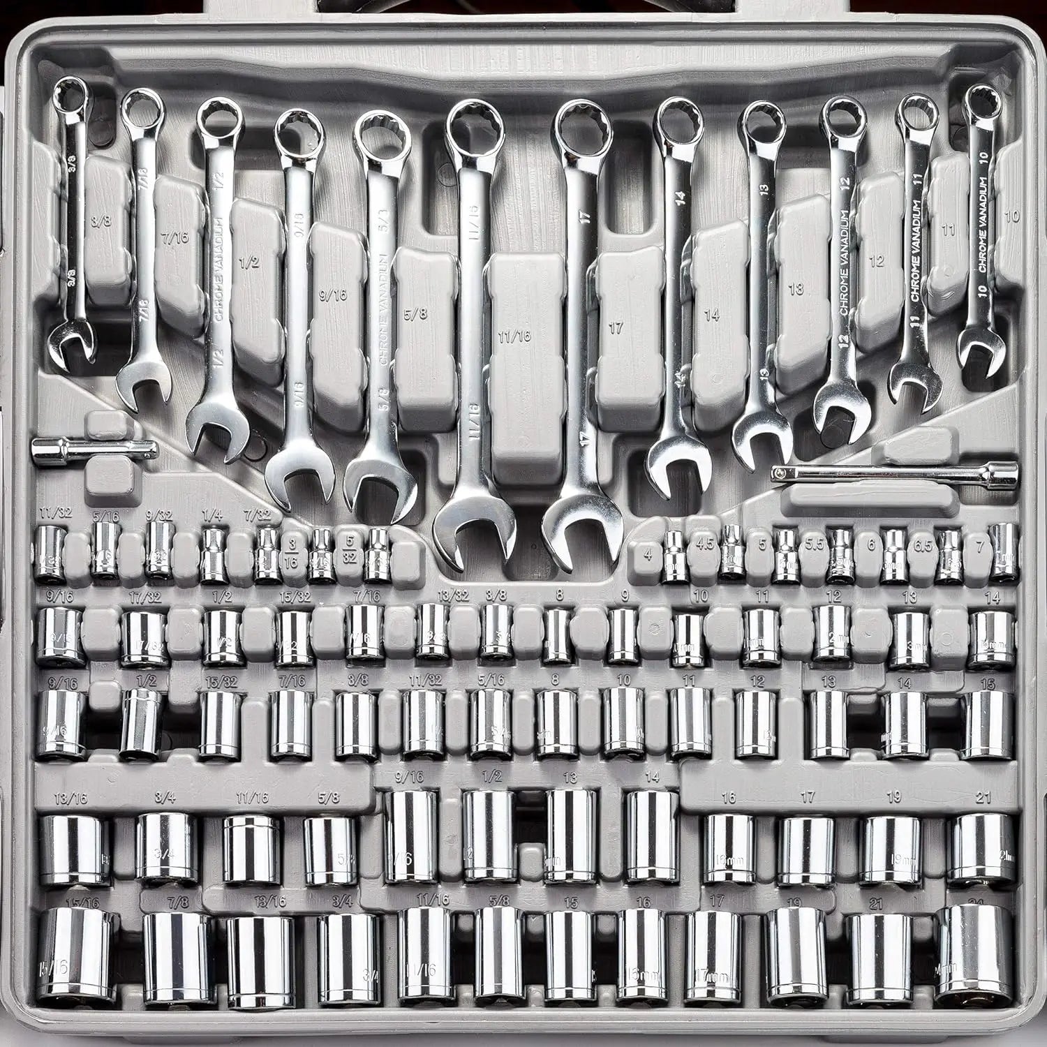 Comprehensive assortment of professional-grade wrenches, ratchets, a complete range of 1/4 inch and 3/8inch metric-sized sockets and precision screwdriver, hammer, pliers, wrench,and etc.