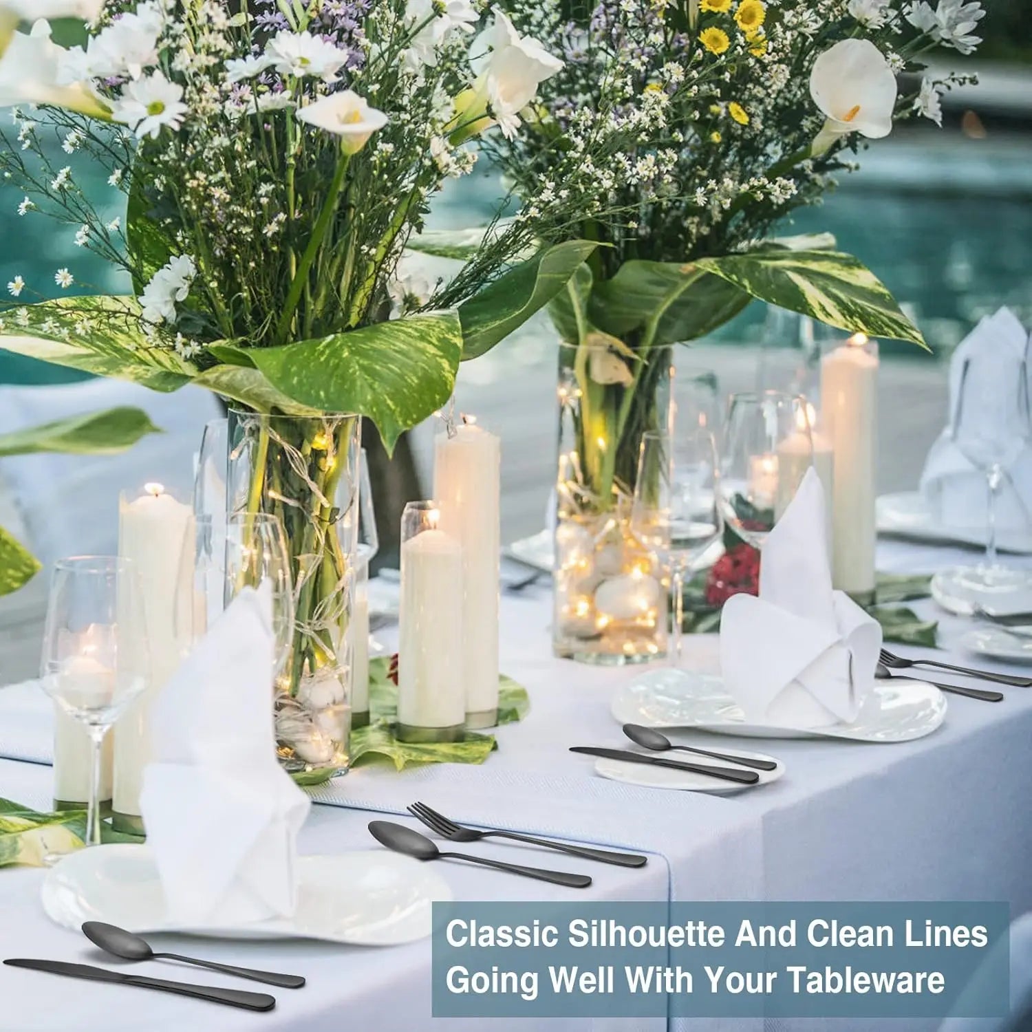 HIGH-END ELEGANT STAINLESS STEEL CUTLERY SET This tableware set is made of food-grade stainless steel, will not fade, bend or break, is rust resistant, corrosion resistant, and is durable for many years. Durable stainless steel provides the longest-term value. Proper thickness without sharp edges. Black looks more retro and noble, making your table more distinctive