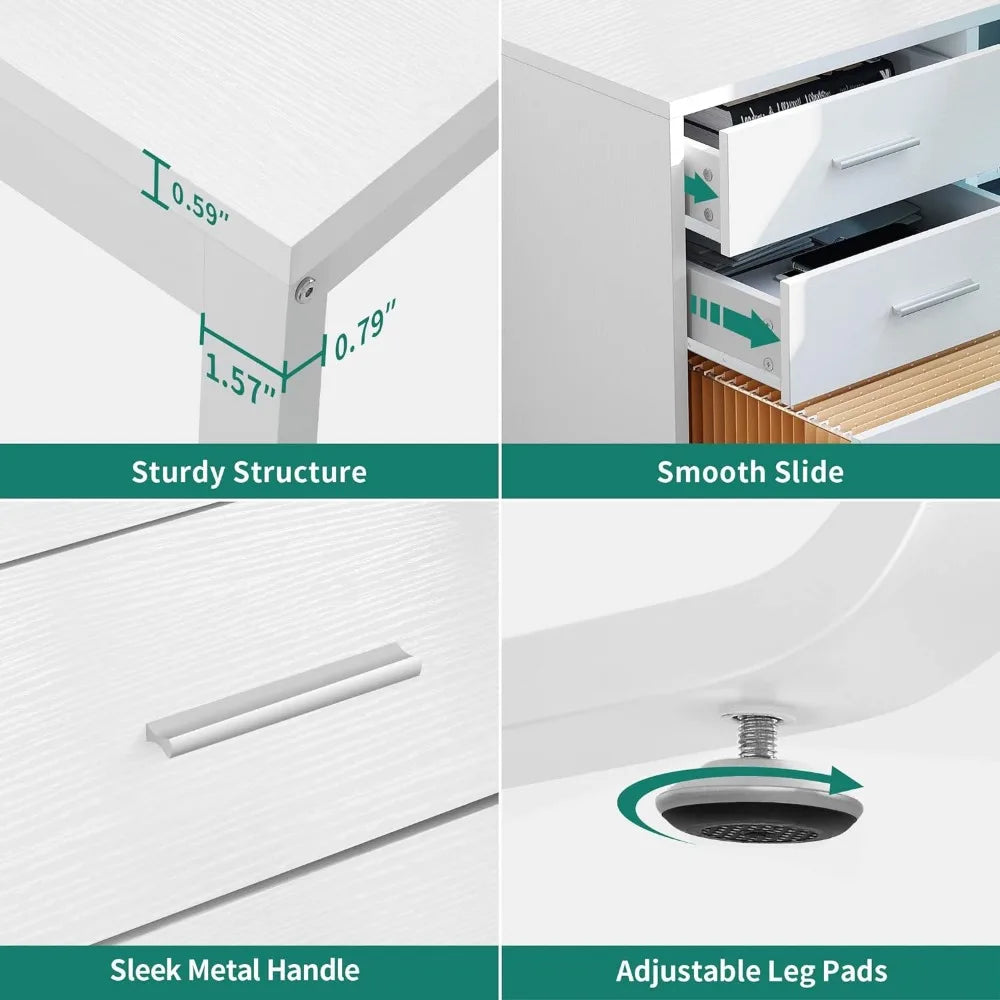L Shaped Desk with File Cabinet: 2-in-1 corner desk combines a computer desk with drawers featuring 1 file drawer with adjustable hanging bars for letter, A4, legal size documents, 2 drawers for small office supplies, and 2 open shelves with 3-heights adjustable for different heights item