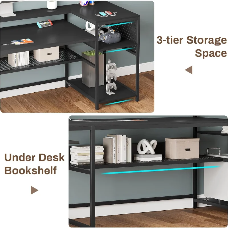 - 【Cool & Smart Led Light 】The computer desk comes with RGB LED light, remote control via APP, Over 60000 colors, and 29 flashing modes for you to choose from. Led lights with music sync function, built-in sensitivity adjustable mic, led light color will change with the rhythm of the sound and music. This l-shaped gaming desk can help you play games for your home offices.