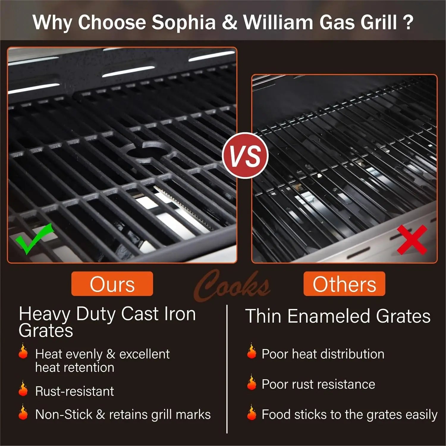 - Porcelain-Enameled Cast Iron Grates: Cooking grates of BBQ grill are made of durable, easy-to-clean porcelain-enameled cast iron material which helps prevent rusting and cracking. Stainless steel burners, porcelain-enamel cast iron cooking grates and porcelain-enamel flame tamer work together to distribute even heat across the entire grilling surface and superior heat retention, preventing hot or cold spots on grates.