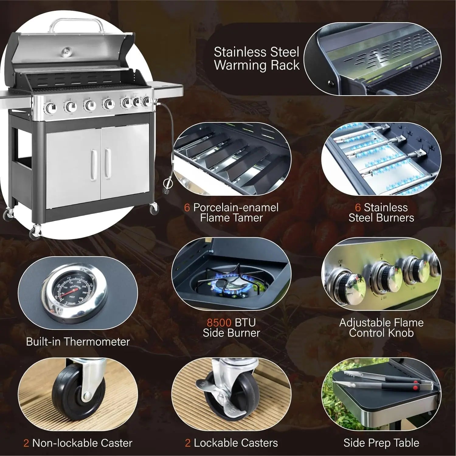 - Stainless Steel Burner: With 6 stainless steel burners and a convenient side burner, you'll have precise control over your heat. Our gas grill features a battery-operated electronic ignition system, ensuring a quick start with the simple push and turn of a control knob. This gas grills provide a total 65,800BTU of cooking power, including a 57,300 BTU main cooking area and an 8,500 BTU side burner.