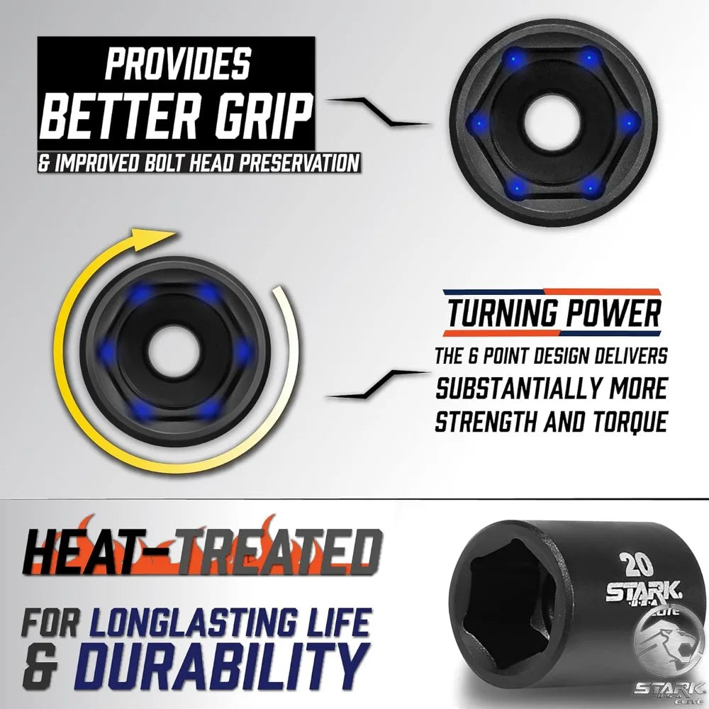 Professionals stay ready, stop wasting time guessing which socket is which. In this tool set each socket, extension bar, and adapter has high contrast laser etched markings for both SAE & METRIC sizes on the sockets making it easy to locate each socket. Carry all of this in a blow-molded hard case with a secure easy-locking mechanism that was designed for safety and efficiency.