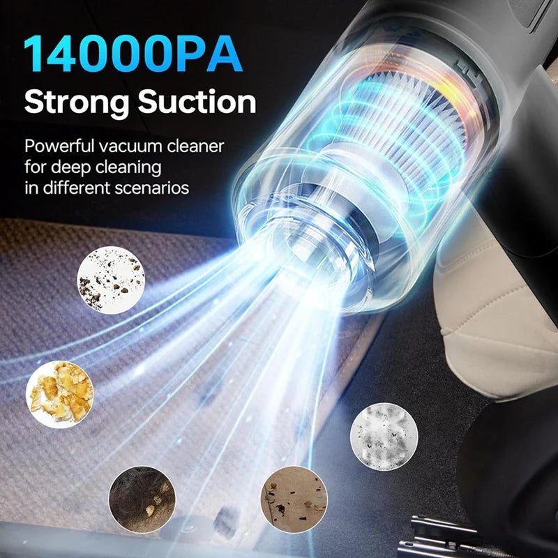 [Powerful Suction]Experience superior cleaning with the cordless handheld vacuum, featuring a 120W motor that delivers a strong 14000Pa suction, perfect for gathering dust, crumbs, pet hair, and other debris swiftly in various settings, from homes to cars.