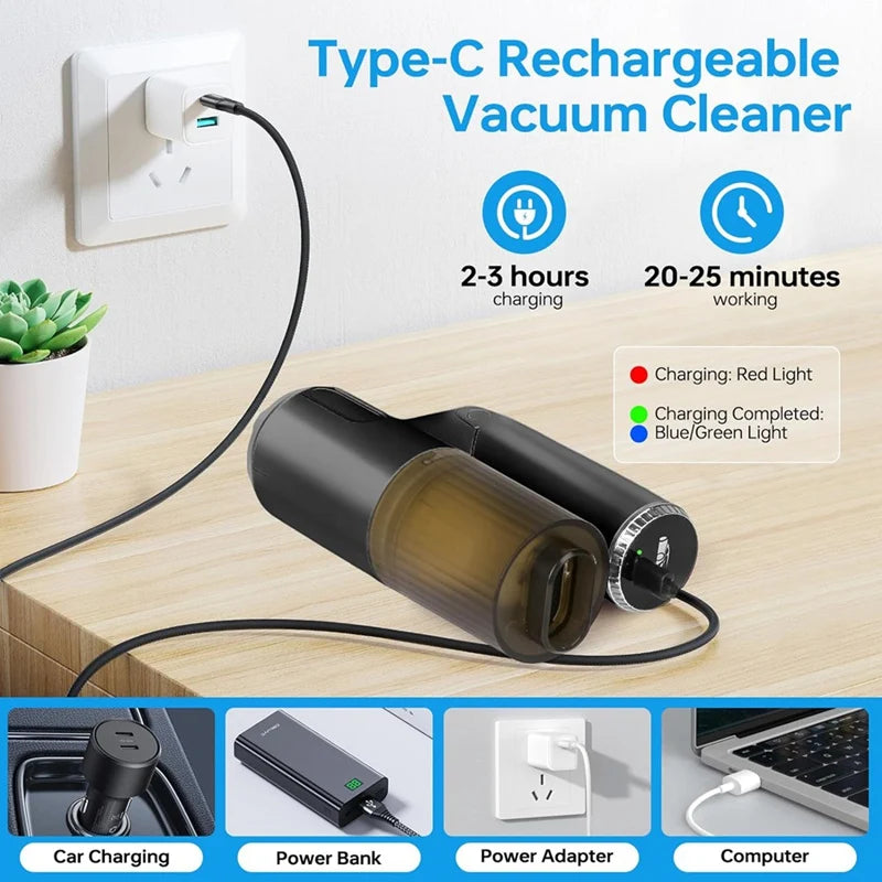 [Extended Battery Life]Fitted with a substantial 4000mAh battery, this portable vacuum provides prolonged cleaning sessions. Complete with a USB Type-C cable, it charges fully in 2-3 hours and supports versatile charging options through cars, standard chargers, or power banks.