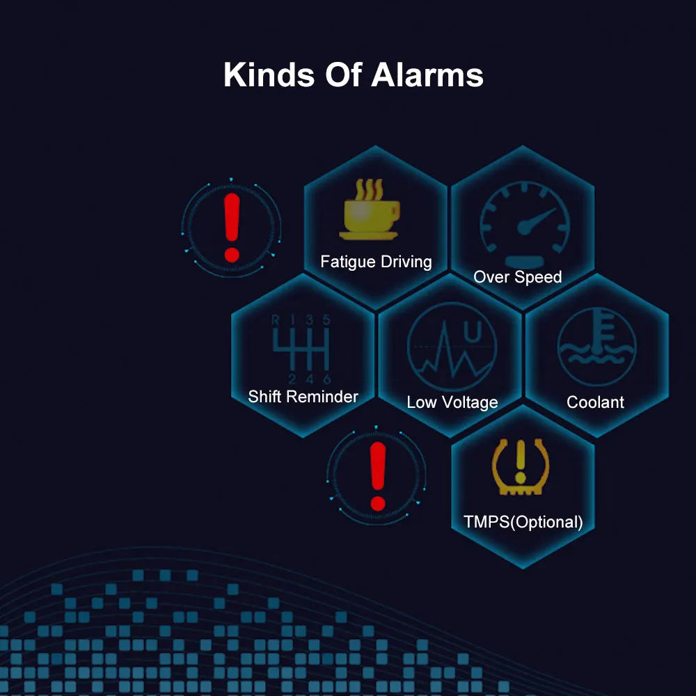 - Alarms: Overspeed,fatigue driving,low voltage,coolant,shift reminder
